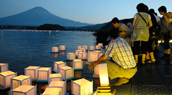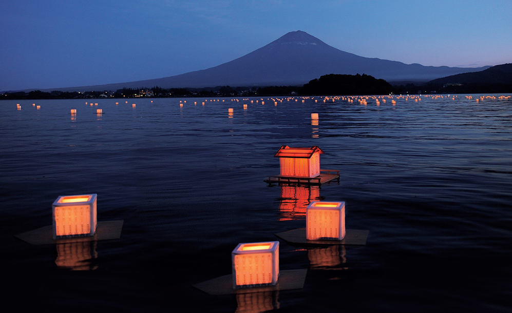 在河口湖舉行的富士山放水燈始於1981年,今年已是第44年了。此活動是人們作為個人或與他人一起共同分享對故人的思念、追憶和感謝的儀式。無論誰都能參與漂放寫上自己寄語的水燈。